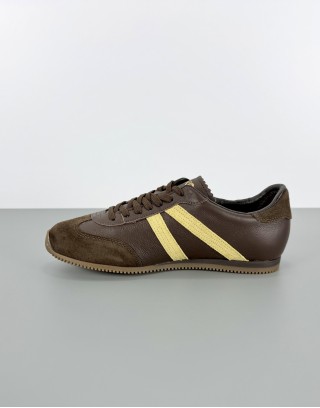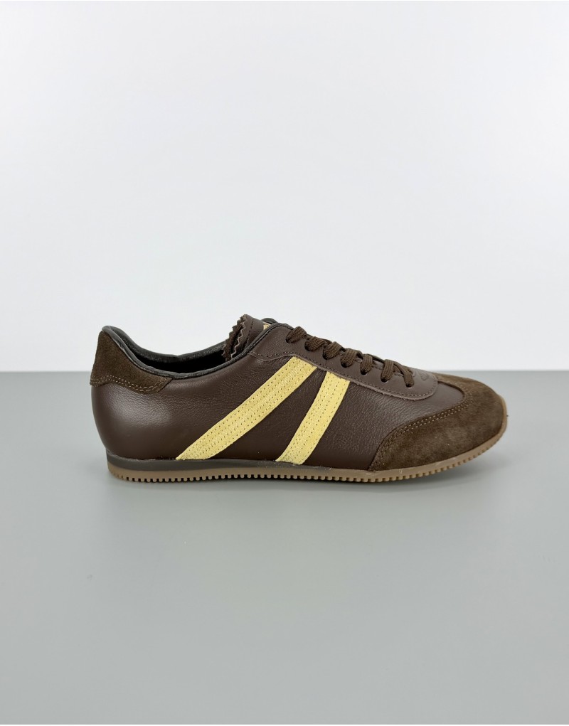 Okrągły nosek i sznurowanie gwarantują idealne dopasowanie. Połączenie kolorów brązowego z jasnożółtym sprawia, że model jest ciekawszą alternatywą dla jednokolorowych sneakersów, wpisując się w miejski, nowoczesny look.