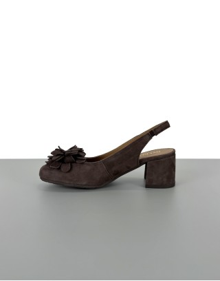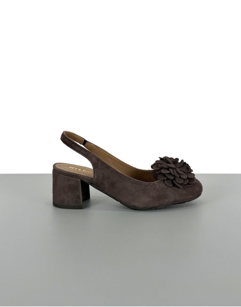 Ciemnobrązowe czółenka bez pięty slingback z kwiatem RYŁKO